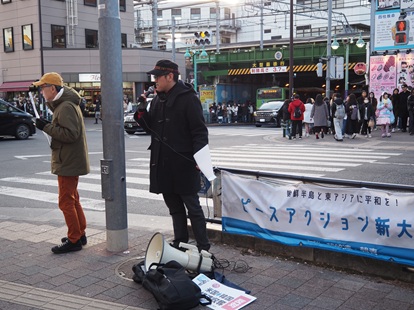 韓統連と韓青は1月31日、都内・新大久保駅前で「ピースアクション新大久保」を開催した。参加者は「米国による韓国への経済収奪反対」「韓米日軍事同盟反対」「韓米合同軍事演習中止」のプラカードを掲げて通行人にアピールした。スピーチの合間には、韓国市民が集会で歌うK-POPの楽曲を紹介。通行人の注目を集めた。