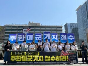 韓国大学生進歩連合(大進連)は4月18日、ソウル光化門の米大使館前で記者会見を開催し、「派兵を強要し戦争の災いの元である駐韓米軍は撤収しろ」と要求した。同日、「侵略戦争糾弾 派兵反対 第4次平和行動」も開催され、参加者は … 続きを読む 大学生が「駐韓米軍は撤収しろ」…第4次平和行動も進行